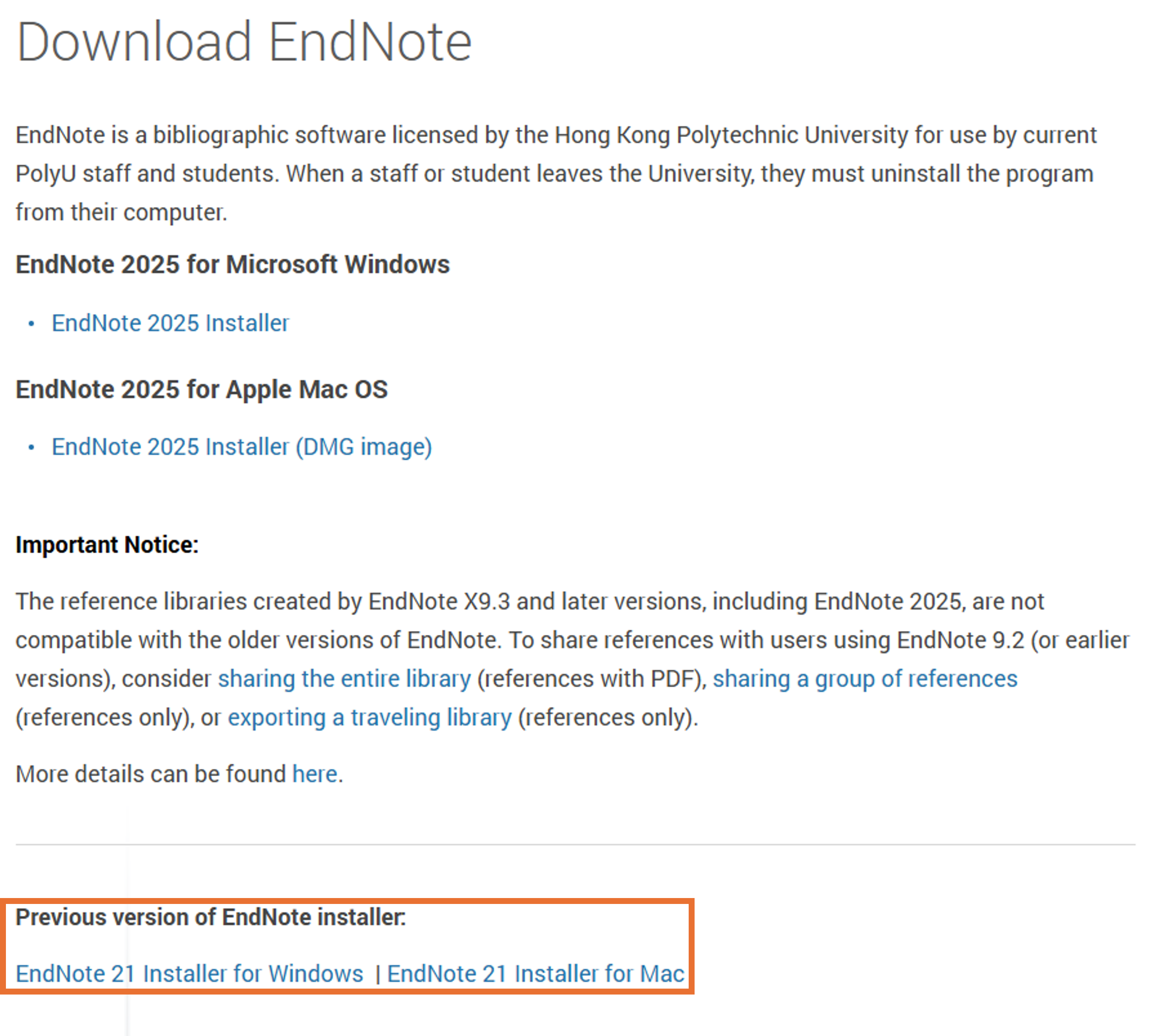The EndNote 21 installer can be found at the bottom of the Download EndNote page. If you created a library using EndNote 2025 and want to read it using an earlier version of EndNote, it is suggested to install at least EndNote version x9.3. More details can be found here.